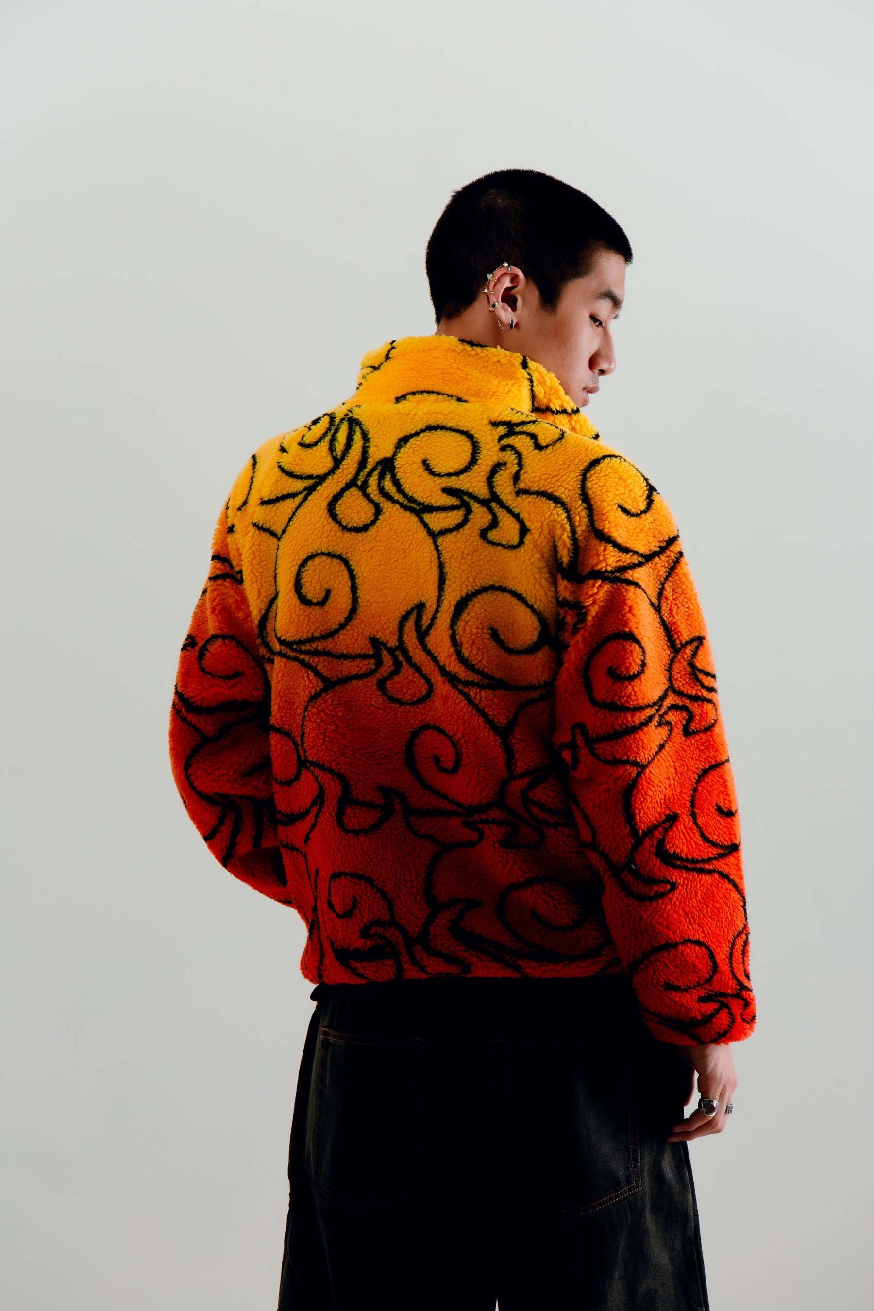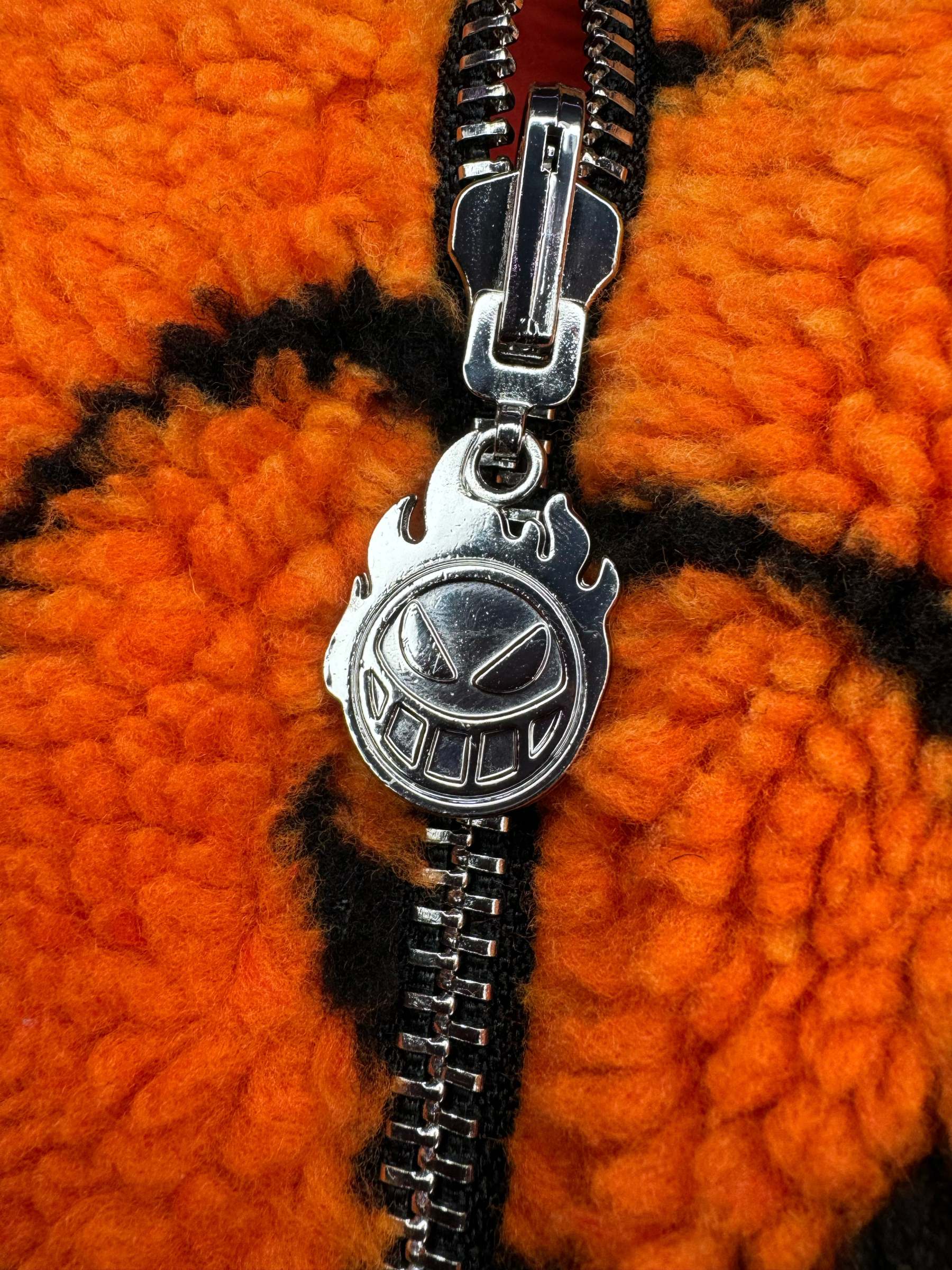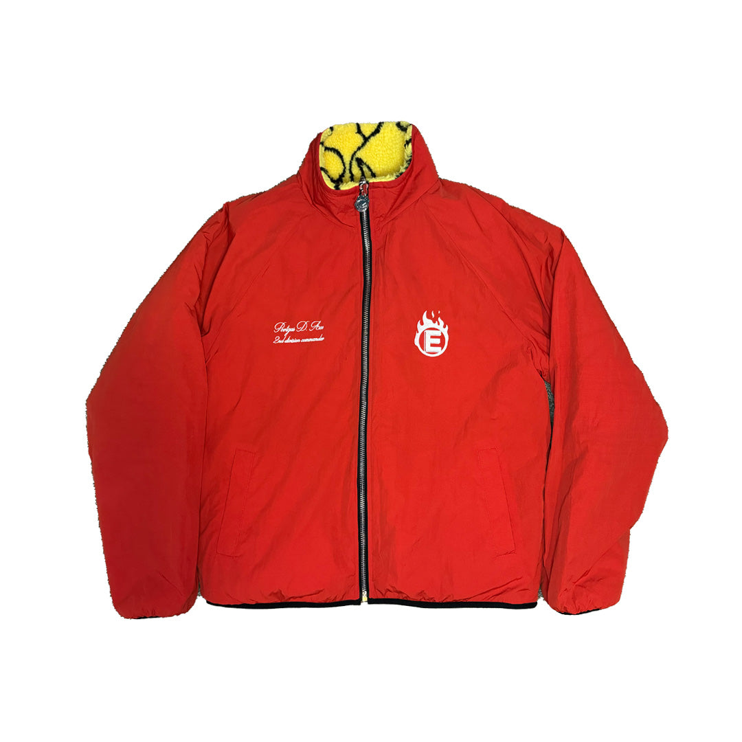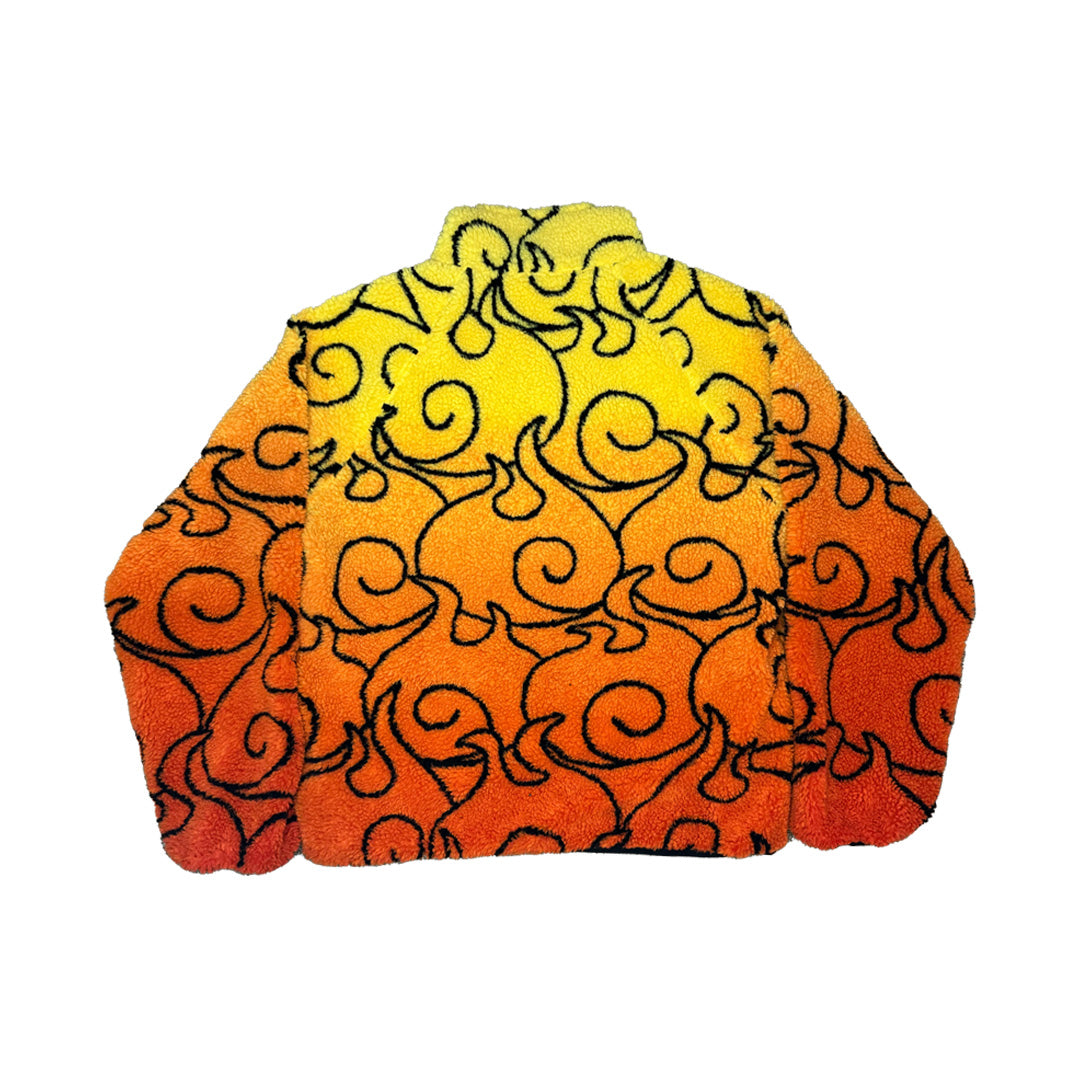 MERA MERA is a reversible sherpa jacket with patterns and motifs from Eichiro Oda's One Piece. Featuring a "Flame Flame" sherpa fleece exterior, and a Portgas D. Ace inspired nylon interior equipped with double pockets.